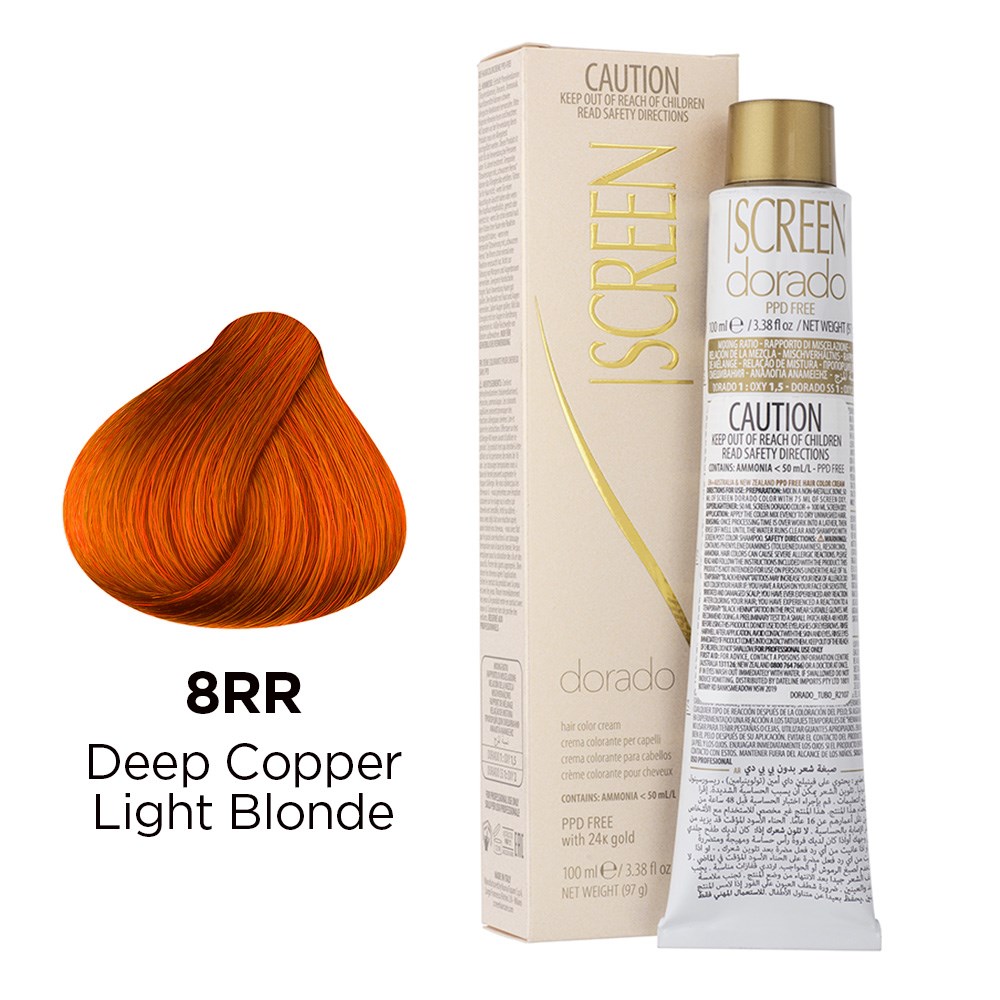 Precious cream colour with unique tonal richness. Developed in a wide range of colours, Screen Dorado Hair Colour Cream 8RR Deep Copper Light Blonde is the culmination of advanced technology, research and continuous testing. This hair colouring cream is PPD-free and enriched with 24K gold for results which are truly incredible. Microparticles of gold reflect light, multiplying the brilliance of colour. Colour is intensely rich and exceptionally long-lasting. Maximum grey coverage and balanced, uniform results. Elite colour created in Italy.
