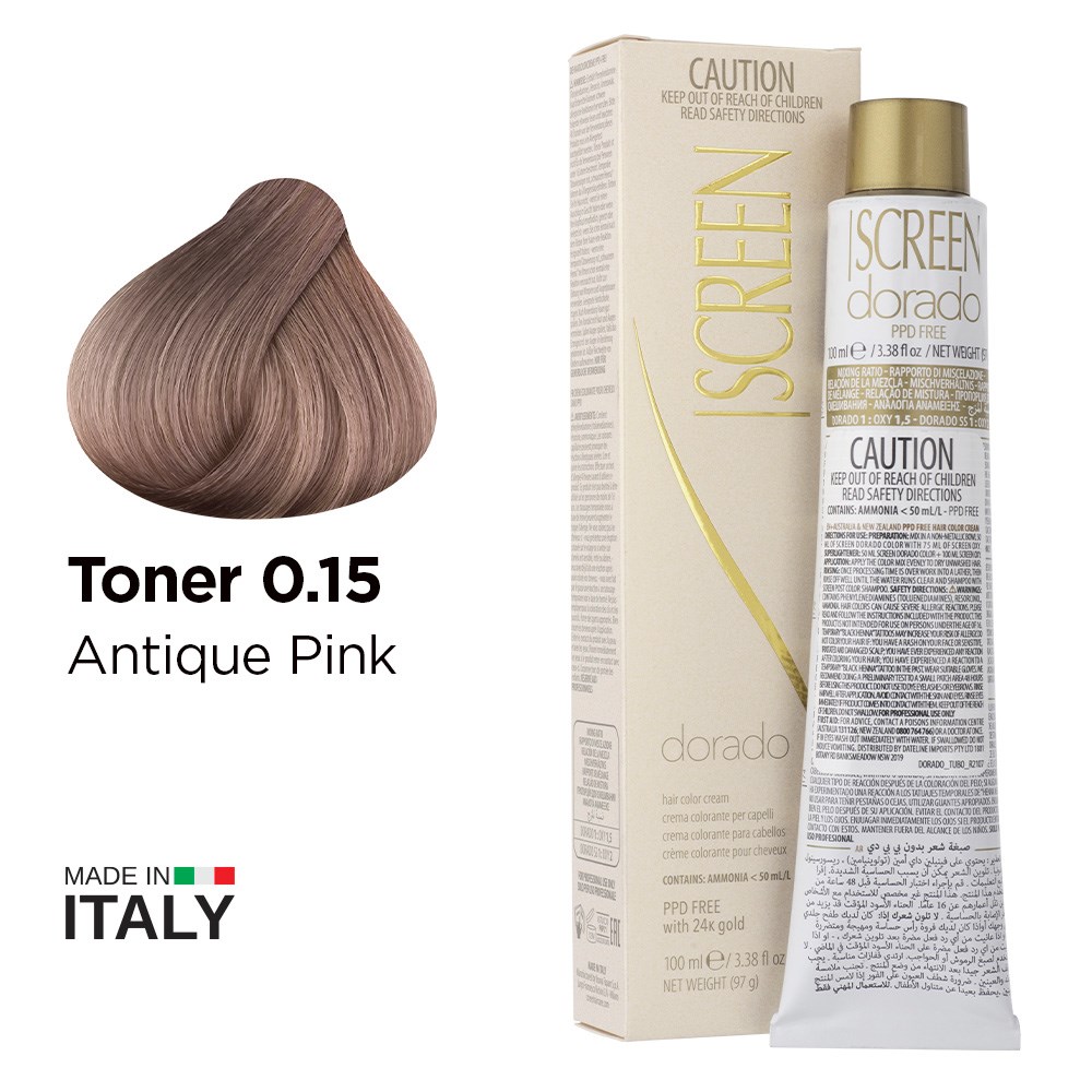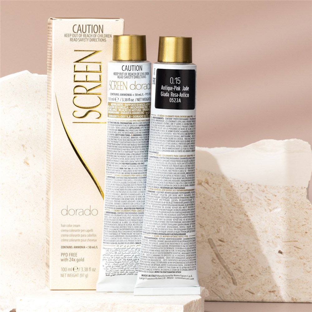 Inspired by the changing colours of the Grand Canyon over the course of the day, Screen has created the beautiful Colorado Twinkle collection. Screen Dorado Hair Colour Toner 0.15 Antique Pink is a precious hair cream with unique tonal richness. This hair colouring cream is PPD-free and enriched with 24K gold for results which are truly incredible. Microparticles of gold reflect light, multiplying the brilliance of colour. Colour is for toning and does not affect the base colour. Ethereal and sophisticated colour created in Italy.
