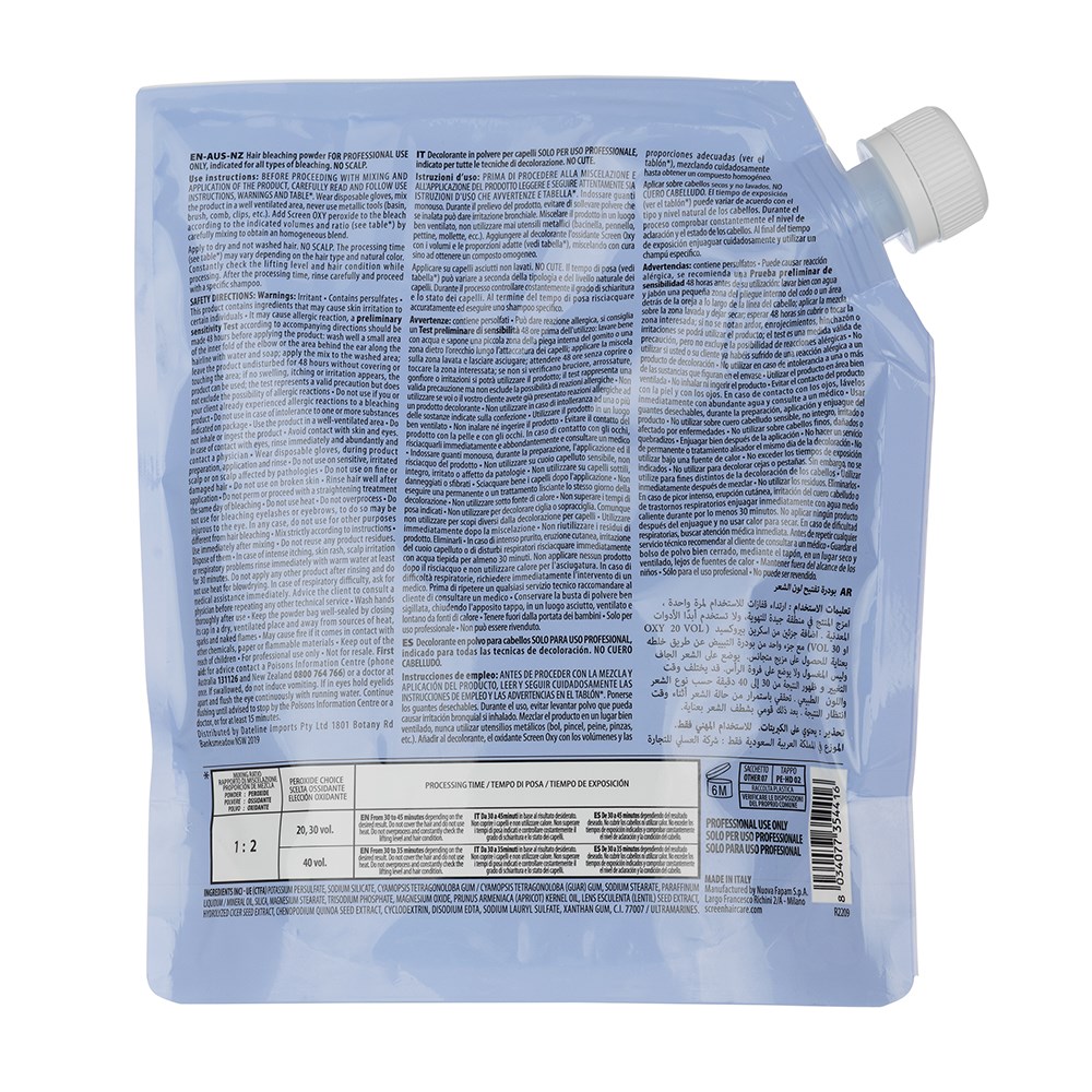 An elite hair product range with a vision to defy norms. Made in Italy, Screen has swept across 68 countries, championed by hair artists who love the advanced ingredients and gorgeous results. Expect outstanding performance from Screen Pure Ammonia Free Hair Bleach Blue. With an innovative ammonia-free formula, this dust-free, non-volatile bleaching powder counteracts yellow and orange tones. Easy to mix while offering maximum control over the lightening process.