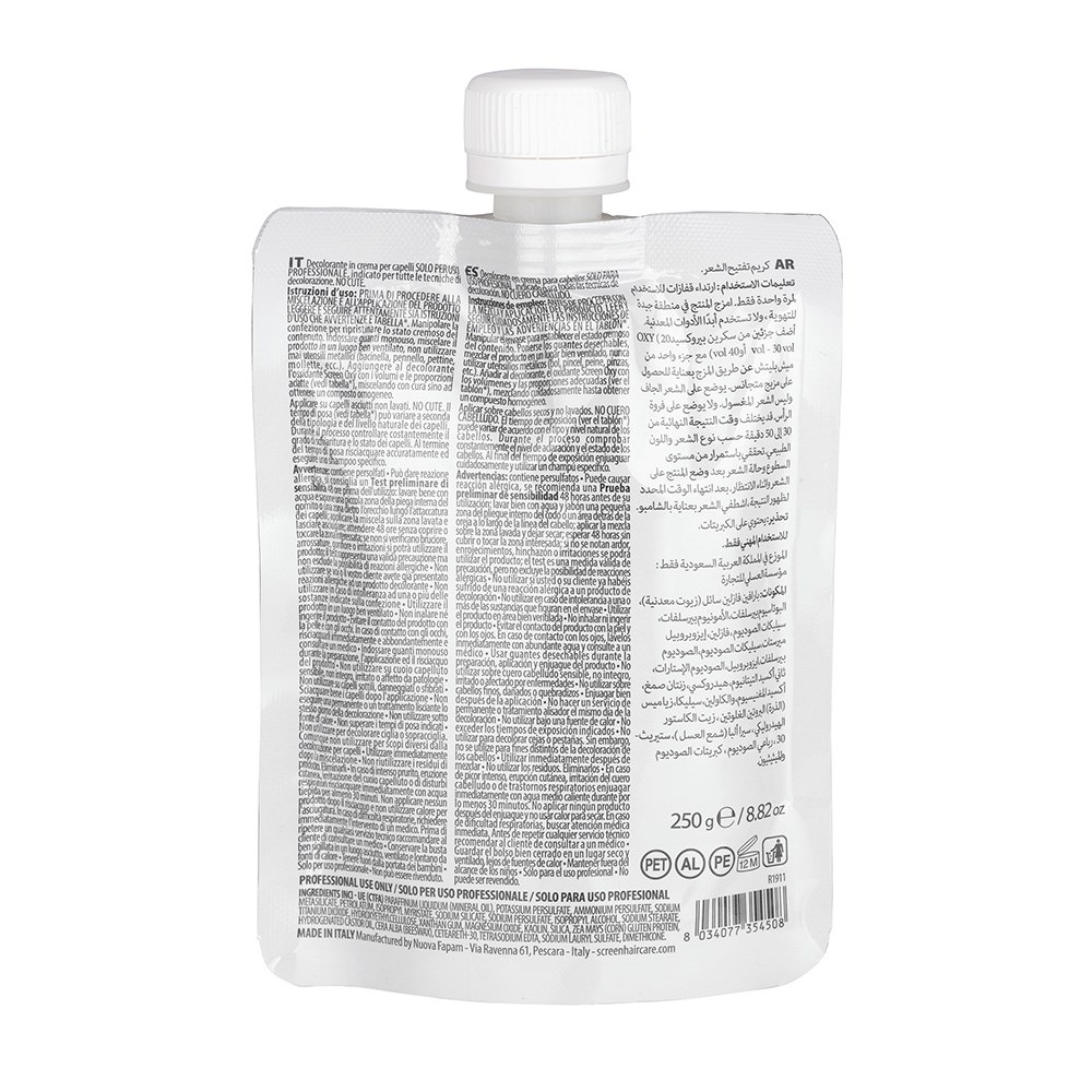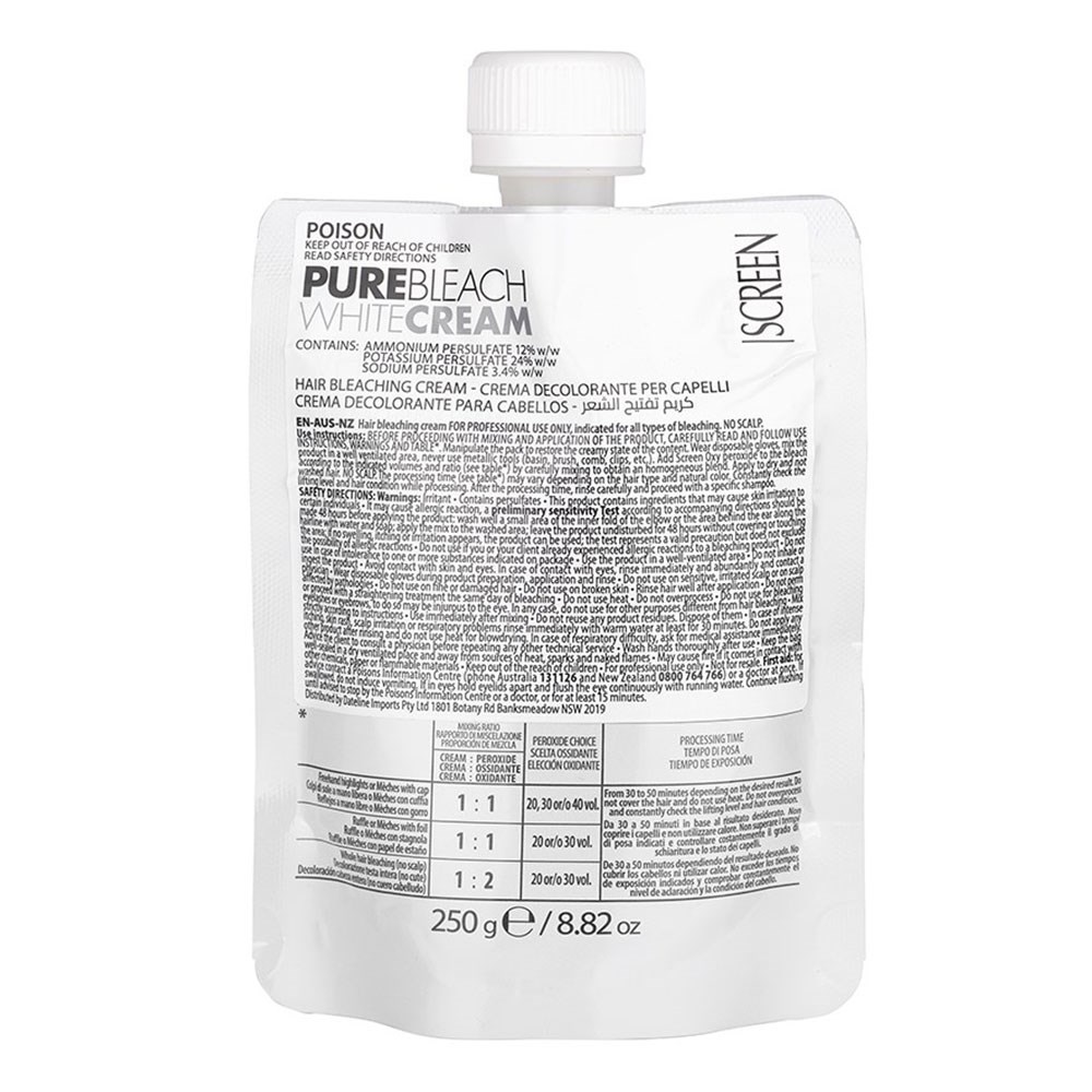 An elite hair product range with a vision to defy norms. Made in Italy, Screen has swept across 68 countries, championed by hair artists who love the advanced ingredients and gorgeous results. Expect outstanding performance from Screen Pure Hair Bleaching Cream White. Indicated for all bleaching techniques, this innovative bleaching cream is easy to use and offers maximum control over the lightening process.