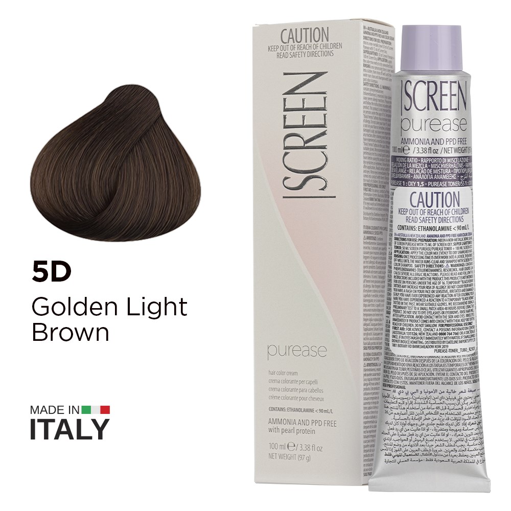 Created from the most advanced research, Screen Purease Hair Colour Cream 5D Golden Light Brown is PPD-free and ammonia-free colouring cream enriched with strengthening pearl protein. Easy and quick application, a nuanced collection of hues and precious ingredients for brilliant shine make Screen Purease Hair Colour Cream a complete colouring system, suitable for satisfying the most creative of desires. Maximum grey coverage, long-lasting and outstandingly uniform results. Elite colour made in Italy.