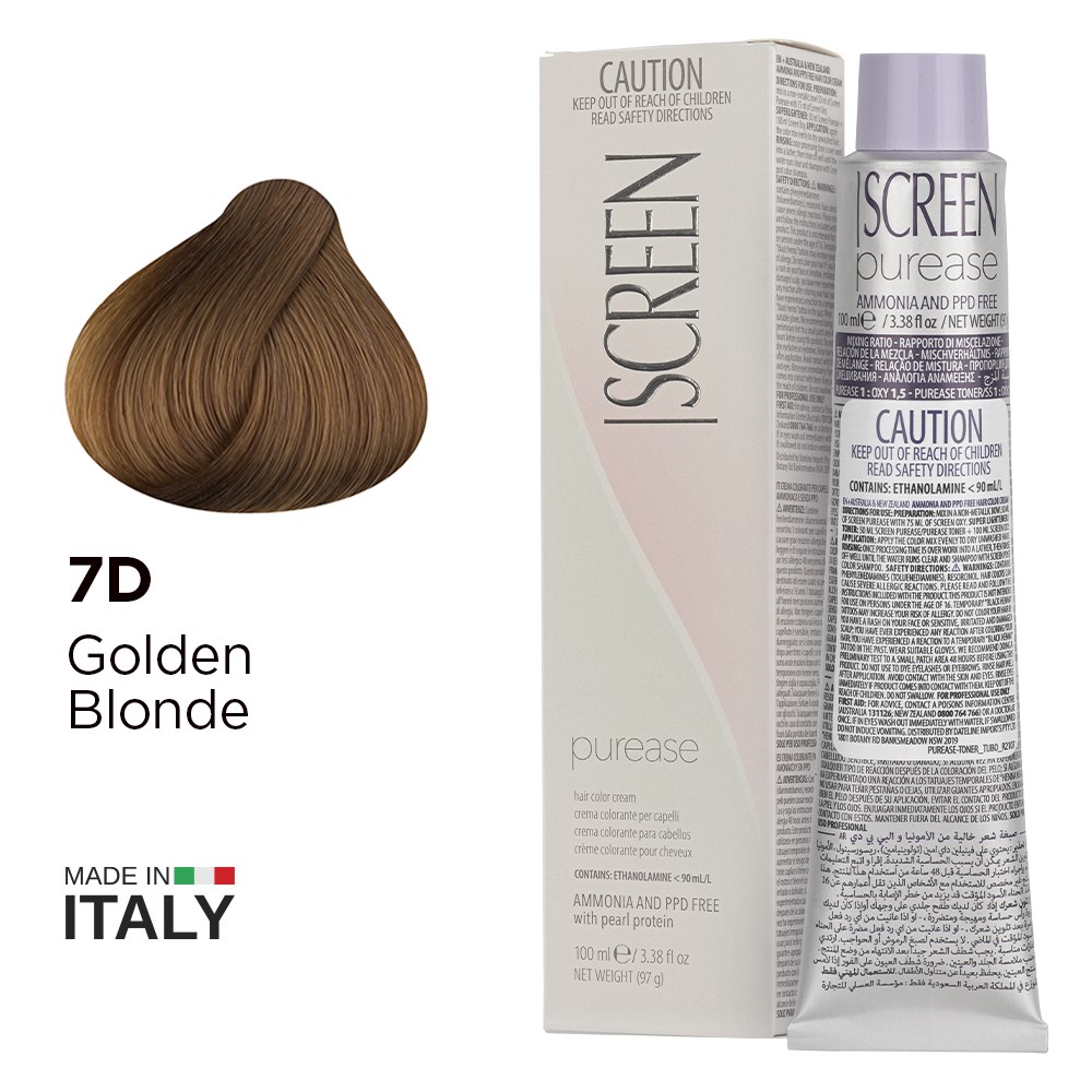 Created from the most advanced research, Screen Purease Hair Colour Cream 7D Golden Blonde is PPD-free and ammonia-free colouring cream enriched with strengthening pearl protein. Easy and quick application, a nuanced collection of hues and precious ingredients for brilliant shine make Screen Purease Hair Colour Cream a complete colouring system, suitable for satisfying the most creative of desires. Maximum grey coverage, long-lasting and outstandingly uniform results. Elite colour made in Italy.