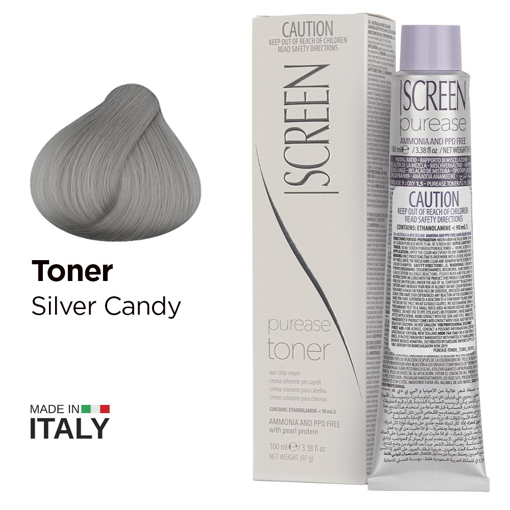 Made in Italy, Screen Purease Hair Colour Cream Toner Silver Candy is PPD-free and ammonia-free toning cream enriched with strengthening pearl protein. Developed with the most advanced research, this toner is exceptionally easy to use and enriched with precious ingredients for brilliant shine and nourishment. Refine every shade of blonde, bleached or natural hair with this special toner, rich in style and vibrancy. Screen Purease Hair Colour Cream Toner collection includes 12 different shades, all suitable for intermixing.