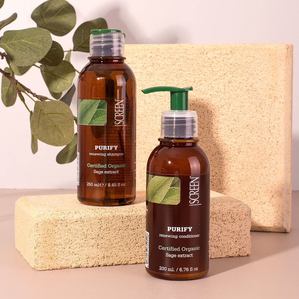 Organic ingredients for the maximum expression of purity. Screen Purest Purify Renewing Shampoo is clean beauty made in Italy. Formulated with certified organic sage extract, this purifying shampoo gently nourishes and deeply cleanses scalp and hair. Sage extract is known for its purifying power, as well as its refreshing scent. SLS-free and paraben-free, this renewing shampoo is suitable for daily use. Naturally derived, non-genetically modified ingredients in a colourant-free formula for vitality and shine renewal.