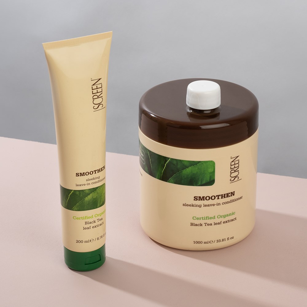 Organic ingredients for the maximum expression of purity. Screen Purest Smoothen Sleeking Leave-In Conditioner 1L is clean beauty made in Italy. Formulated with certified organic black tea leaf extract, this leave-in conditioner relaxes frizzy hair for maximum softness and manageability. Black tea leaf is known for its restructuring and moisturising abilities. SLS-free and paraben-free, this smoothing conditioner is suitable for daily use. Naturally derived, non-genetically modified ingredients in a colourant-free formula for smoothness and silkiness.