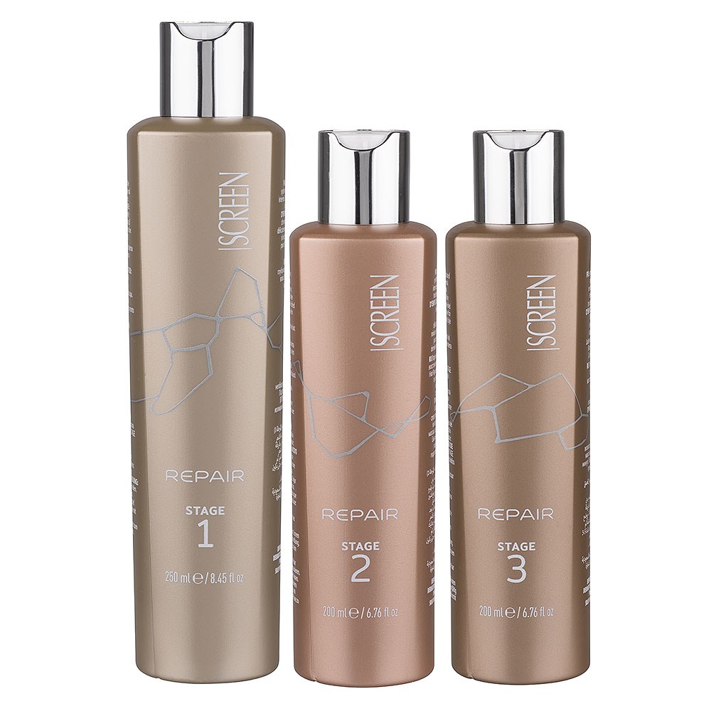 Rebuild dry, damaged hair instantly. Powered by Keratin Intensive Complex, Screen Repair Internal Reconstruction System is a revolutionary repair system for damaged, stressed and chemically treated hair, suitable for use at-home. An exclusive concentrate of 20 amino acids renews balance, strength and softness. Low molecular weight proteins penetrate deeply for optimal reconstruction of the cortex, while high molecular weight proteins renew the cuticle. This is stage 3 of the 3 step repair system. Screen Repair Internal Reconstruction Stage 3 Hair Treatment is an intense repair treatment which closes, seals and repairs the cuticle for bountiful shine and hydration.