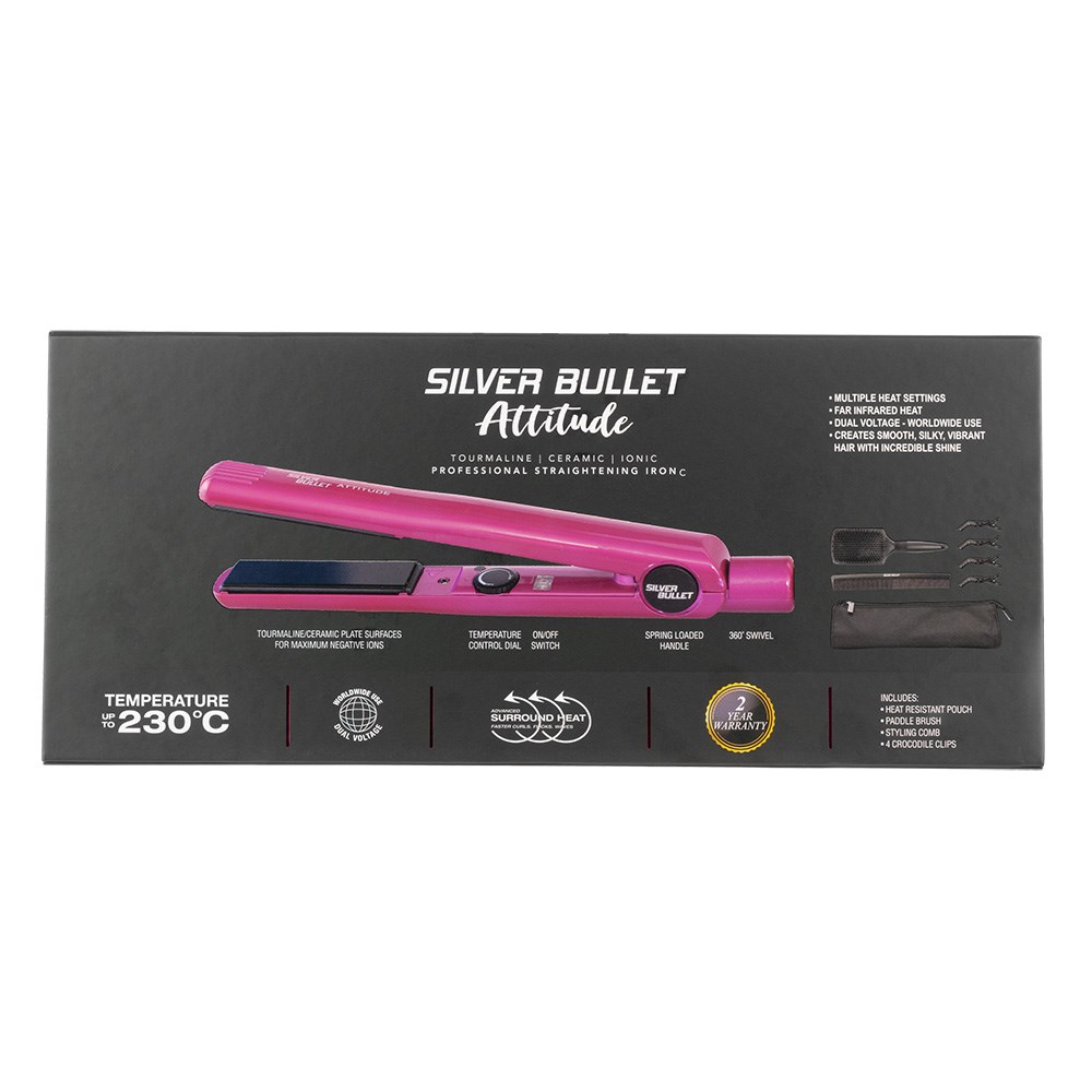 Short on time? The Silver Bullet Attitude Hair Straightener Pink styles hair fast, whether you’re after sleek straightening or conditioned curling. Simply dial in your desired temperature from 80°C to 230°C, to suit clients of all textures and hair types, and get smooth, silky, vibrant results with incredible shine.