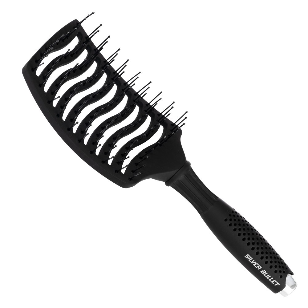 Create hair as smooth and soft as velvet. The Silver Bullet Black Velvet Curved Vent Paddle Hair Brush is ideal for detangling, smoothing, and drying. Its vented design speeds up blow drying for enhanced efficiency, while the curved head contours to the scalp for superior comfort. Featuring durable nylon bristles, this brush delivers luxurious results with ease.