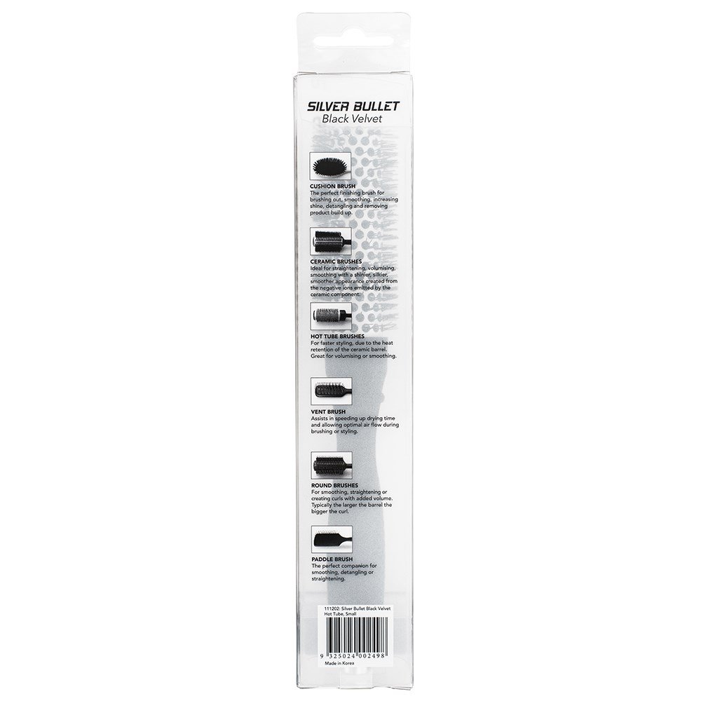 Create hair as smooth and soft as velvet with Silver Bullet Black Velvet Hot Tube Hair Brushes. A hollow, ceramic barrel fights frizz, allowing air to circulate underneath hair sections for fast, thermal styling and a smooth, shiny finish. Densely clustered nylon bristles provide perfect the tension for a smoother, sleeker result. The ergonomic, lightweight handle affords comfort and control, designed for extended salon use. Luxurious results with ease from Silver Bullet!