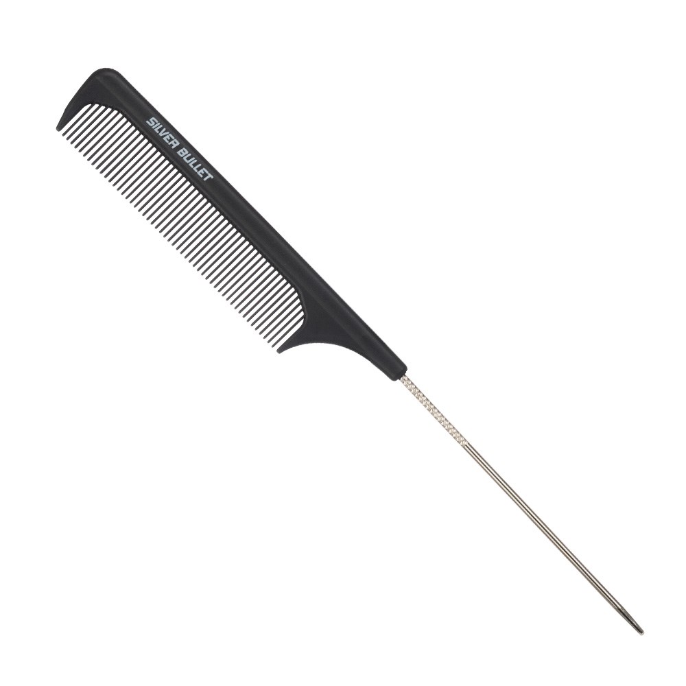 Silver Bullet Carbon. Strong. Resistant. Super-smooth. Silver Bullet Carbon Metal Tail Comb is made from carbon fibre and unconditionally guaranteed against breakage. Super-smooth teeth effortlessly glide through all hair types. Heat resistant. Ideal for use with chemicals. This 22.1cm comb is best suited to precision styling, parting and sectioning hair. The metal pin tail is durable and long-lasting. Use during foiling and highlighting or for creating updos and braiding.