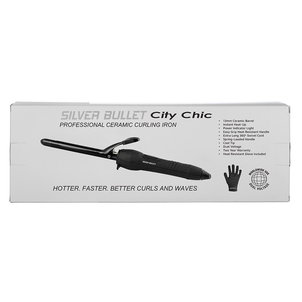 The Silver Bullet City Chic Ceramic Curling Iron 13mm styles fast for style that lasts. The City Chic 13mm locks in tight, spiral curls all-day and all-night thanks to the ceramic barrel technology. The smooth ceramic barrel also aids to create curls that are always frizz-free and super shiny. Instant heat up has you styling quicker than ever. Safety cool tip end protects fingers. Dual voltage for worldwide use. Silver Bullet…Hotter. Faster. Better. Curls and Waves.