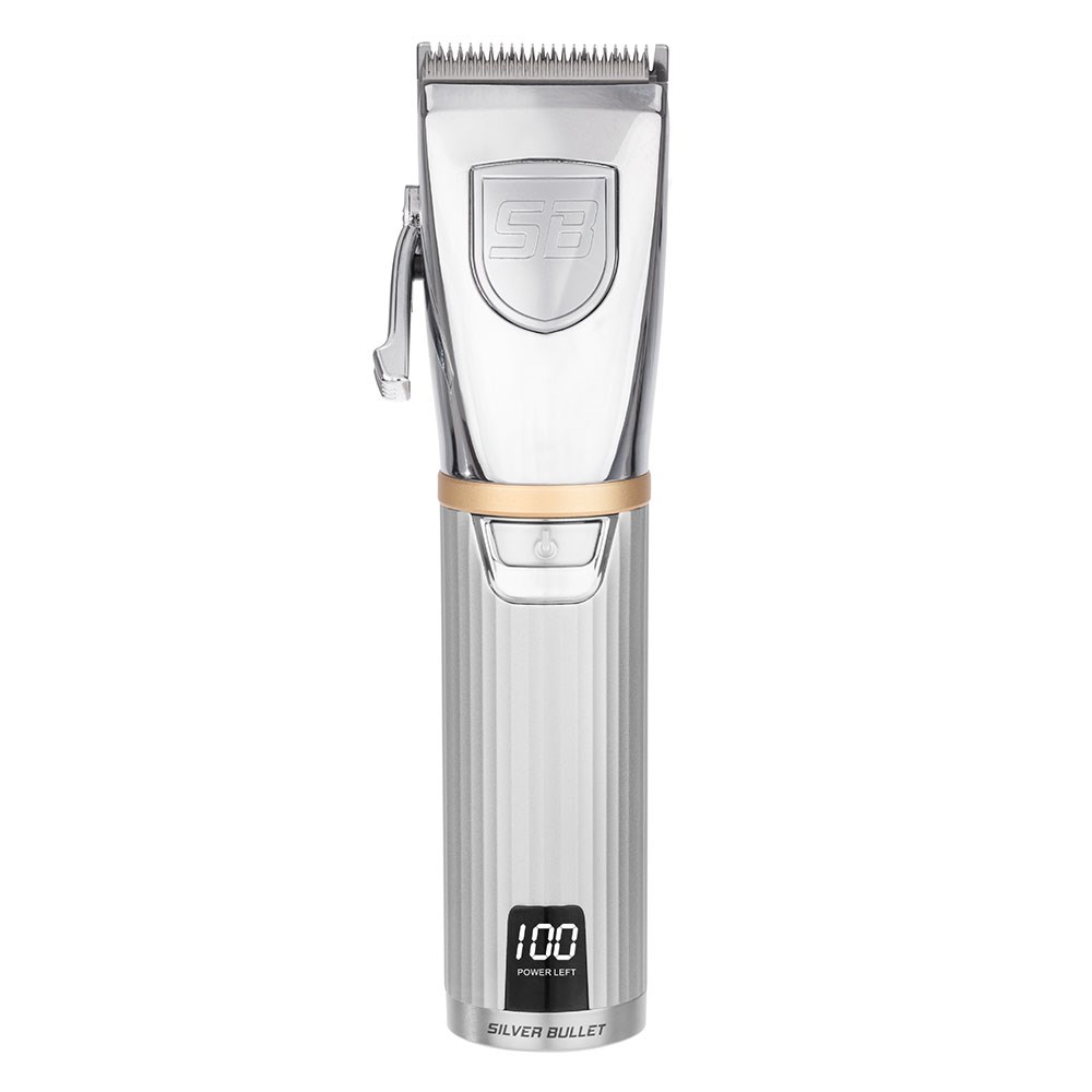 Elite performance in shining armour. Silver Bullet Grenadier Metal Hair Clipper Silver is an outstanding salon clipper for all hair types. This is a retro metal clipper with cutting edge features, including multiple speed settings up to 6,500 rpm to suit every client’s needs. Stainless steel blades for impeccable precision and all-day usage without overheating. 2,000 mAh lithium battery for 3 hours cordless runtime without compromise. Adjustable taper, 8 comb attachments and a digital display. Precision without the price tag, Silver Bullet Grenadier Metal Hair Clipper awaits your command.