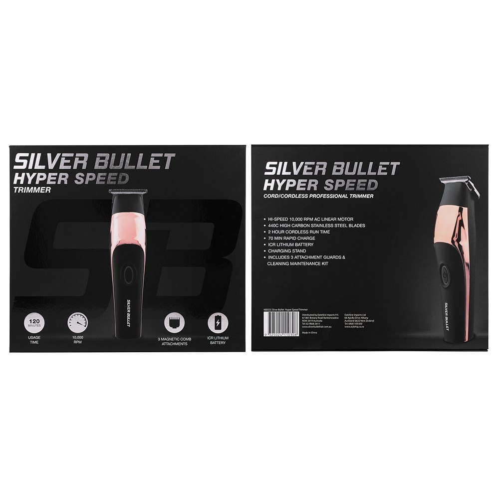 Trimming goes hyper speed. Powered by a super high speed 10,000 rpm AC linear motor, Silver Bullet Hyper Speed Hair Trimmer is super efficient, powerful and precise. This professional cord/cordless trimmer in gorgeous rose gold and black features two hour cordless runtime plus 70 minutes rapid charge. 440C high carbon stainless steel blade delivers a smooth cutting action.