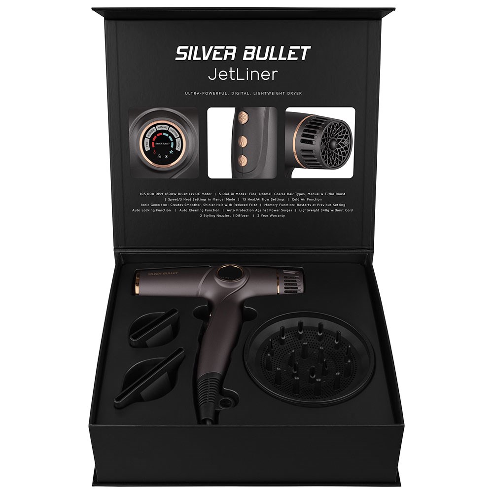 Ultra-powerful, super lightweight and digital. Fly high on futuristic performance with Silver Bullet JetLiner Hair Dryer. The most advanced technology is here. Incredible 105,000 rpm, 1800 watt, brushless DC motor. Five dial-in modes: fine, normal, coarse, manual and turbo boost, ensuring a setting for every hair type and every styling desire. Manual mode includes 3 speed/3 heat settings, plus there’s also a cool shot function. Ionic generator for silky smooth, shiny and frizz-free hair. Super lightweight at only 348g. With sleek, streamlined design, Silver Bullet JetLiner Hair Dryer helps creativity take flight.