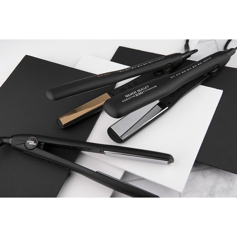 Presenting the limited edition Silver Bullet Keratin 230 Gold Titanium Straightening Hair Iron. Encased in a beautiful box, this limited edition straightener features stunning gold titanium plates. Gorgeous gold plates combined with adjustable heat up to 230°C to tame even the most unmanageable hair. Advanced surround heat creates curls, waves and straightened hair easier and faster.