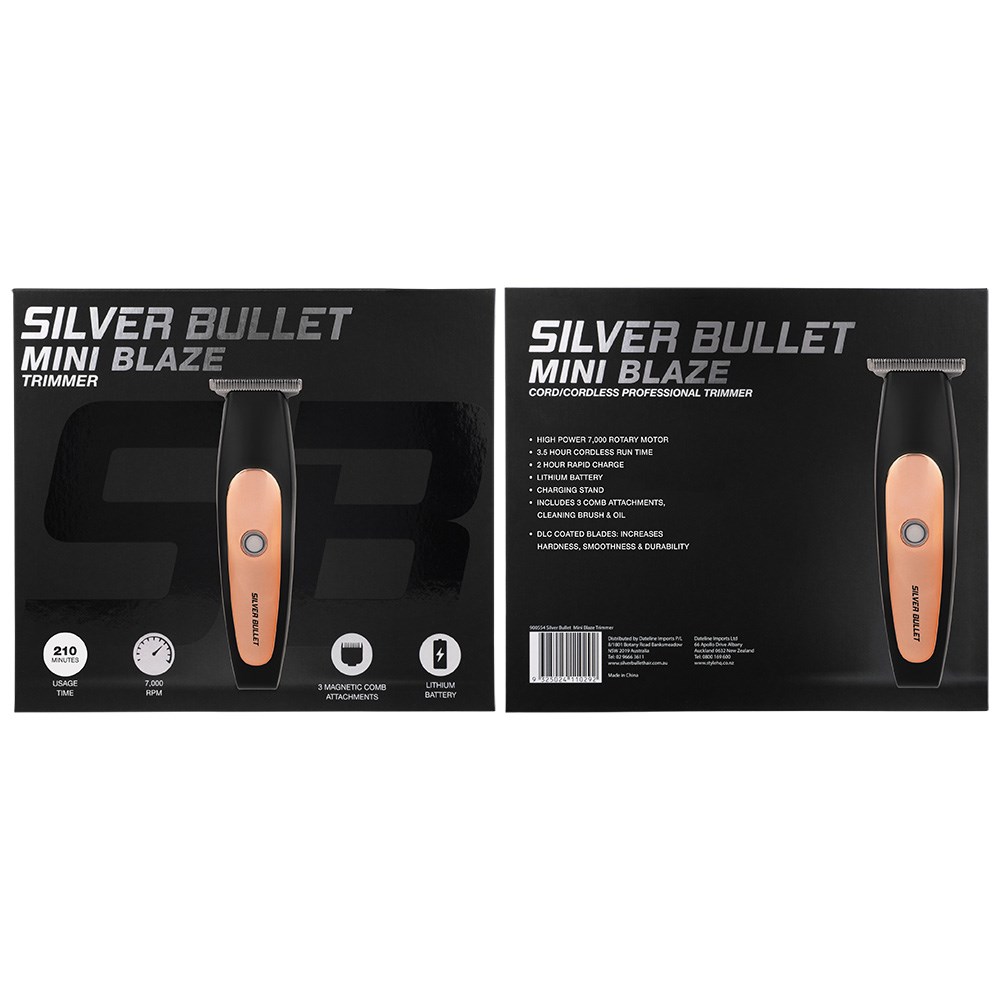 The closer, faster, better trimmer in a smaller, more convenient size. Powered by a mighty 7,000 rpm rotary motor, Silver Bullet Mini Blaze Hair Trimmer is super efficient, powerful and precise. This professional cord/cordless trimmer in gorgeous rose gold and black features 210 minutes cordless runtime plus two hour rapid charge. Non-irritating black diamond carbon DLC blade delivers amazing precision.