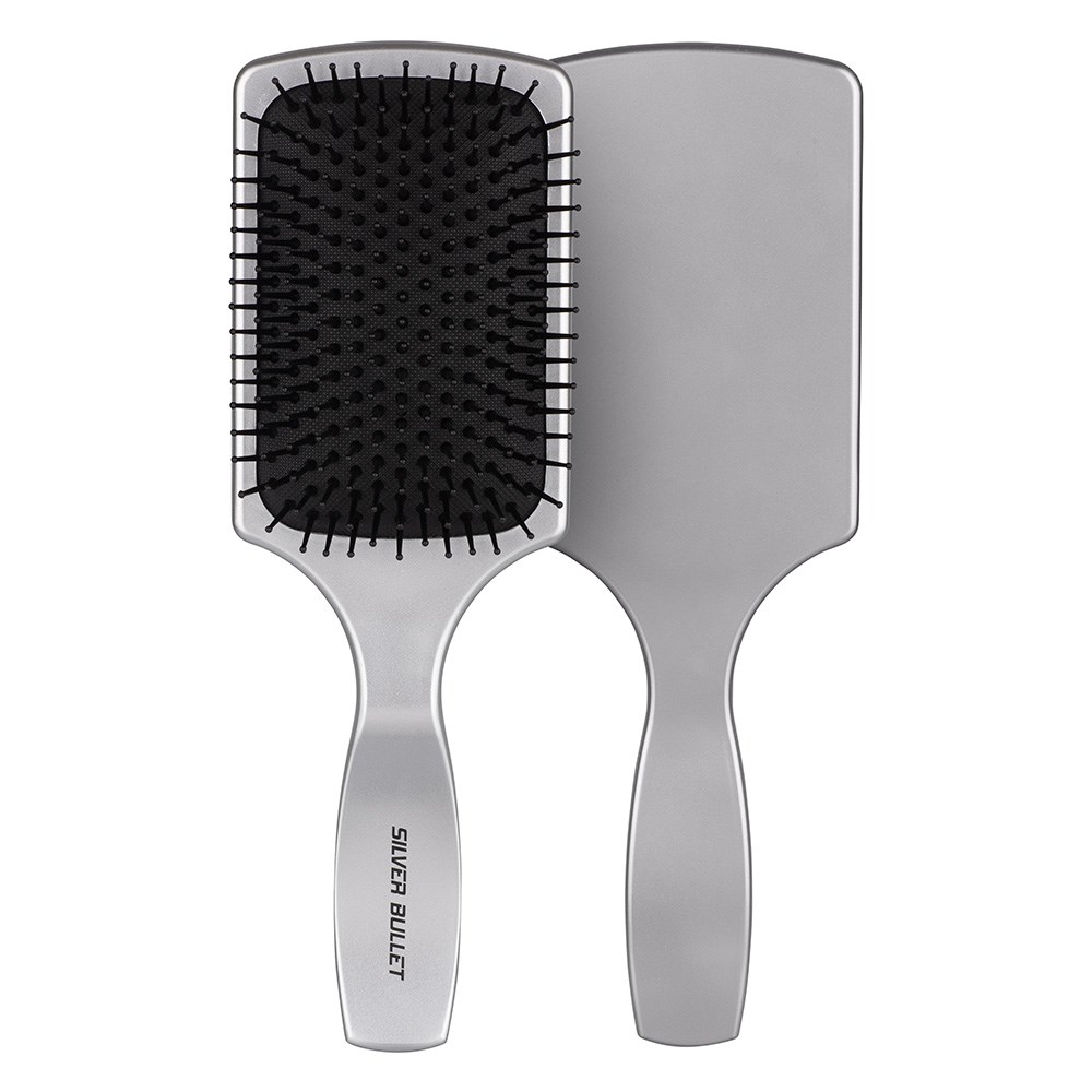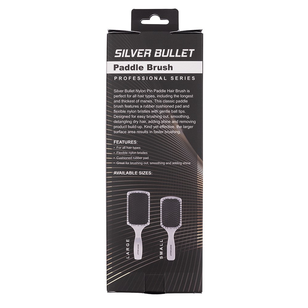 This is the quintessential paddle brush. Silver Bullet Nylon Pin Paddle Hair Brush Large is perfect for all hair types, including the longest and thickest of manes. This classic paddle hair brush features a rubber cushioned pad and flexible nylon bristles with gentle ball tips. Designed for easy brushing out, smoothing, detangling dry hair, adding shine and removing product build-up. Kind yet effective, the larger surface area results in faster brushing.