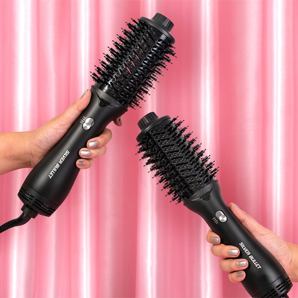 Showstopping hair is fast, easy and convenient with Silver Bullet ShowStopper Professional Blowout and Volumizier Brush. Dry, volumise and smooth at the same time – no blow-drying needed! This nifty hot air brush combines a powerful 1000W DC motor, tangle-free bristles with added grip and a 58mm oval barrel. Smooth, shiny results with less frizz courtesy of an ionic generator and tourmaline/ceramic technology. 3 heat settings are suitable for every hair type. Lightweight and comfortable to use, this sleekly designed hot air brush makes drying and styling a pleasure.