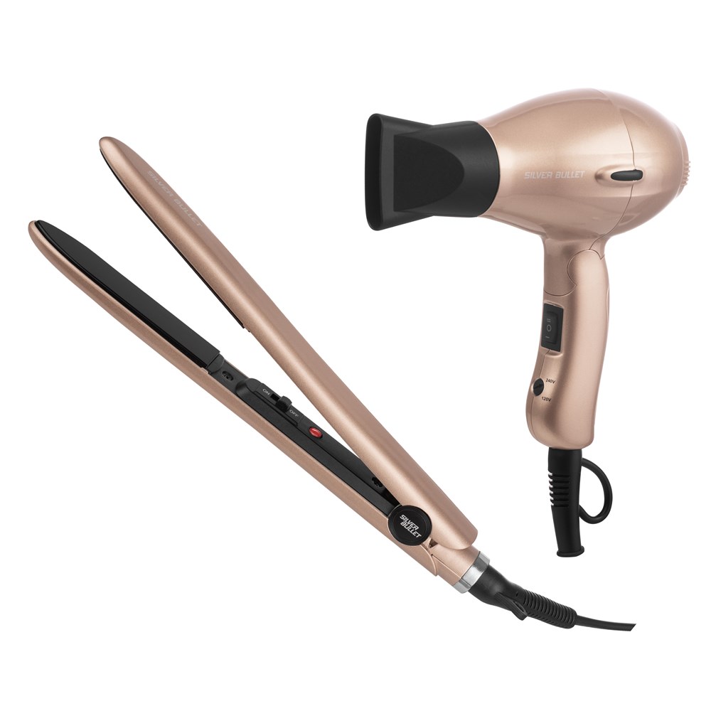 Ready, set, go! Professional styling on-the-go with Silver Bullet Styleaway Hair Dryer and Straightener Travel Set. Silver Bullet Runway Foldable Mini Travel Hair Dryer packs power with 22,000 RPM 1200W DC motor, two heat/speed settings and 12 m/s air speed. Silver Bullet Midi Travel Hair Straightener features tourmaline ceramic coated plates and heat to 220°C. Both compact tools are dual voltage for worldwide use. The hotter, faster, better travel set!