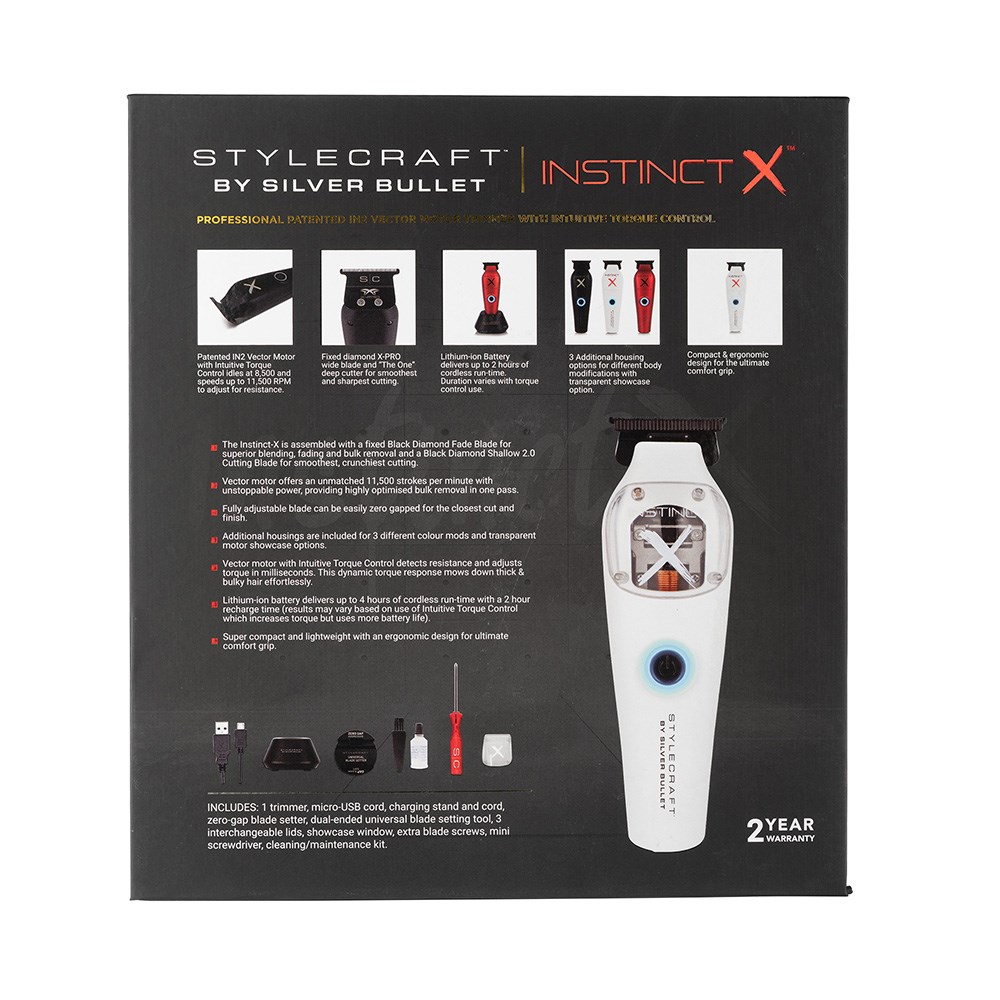 Powerful vector motor trimmer with intuitive torque control. StyleCraft by Silver Bullet Instinct X Hair Trimmer is the perfect combination of extreme power, innovative technology and an ergonomically designed, compact and customisable body. With intuitive torque control, the Instinct X detects resistance and adjusts torque in mere moments. Dynamic torque response effortlessly cuts with ease and precision. Patented IN2 vector motor idles at 8,500 rpm and speeds up to 11,500 rpm. Fixed Black Diamond Carbon DLC X-PRO wide blade and The One deep cutter for smoothest and sharpest cutting. Lithium-ion battery delivers up to two hours of cordless runtime. Three additional housing options for different body modifications with transparent showcase option.