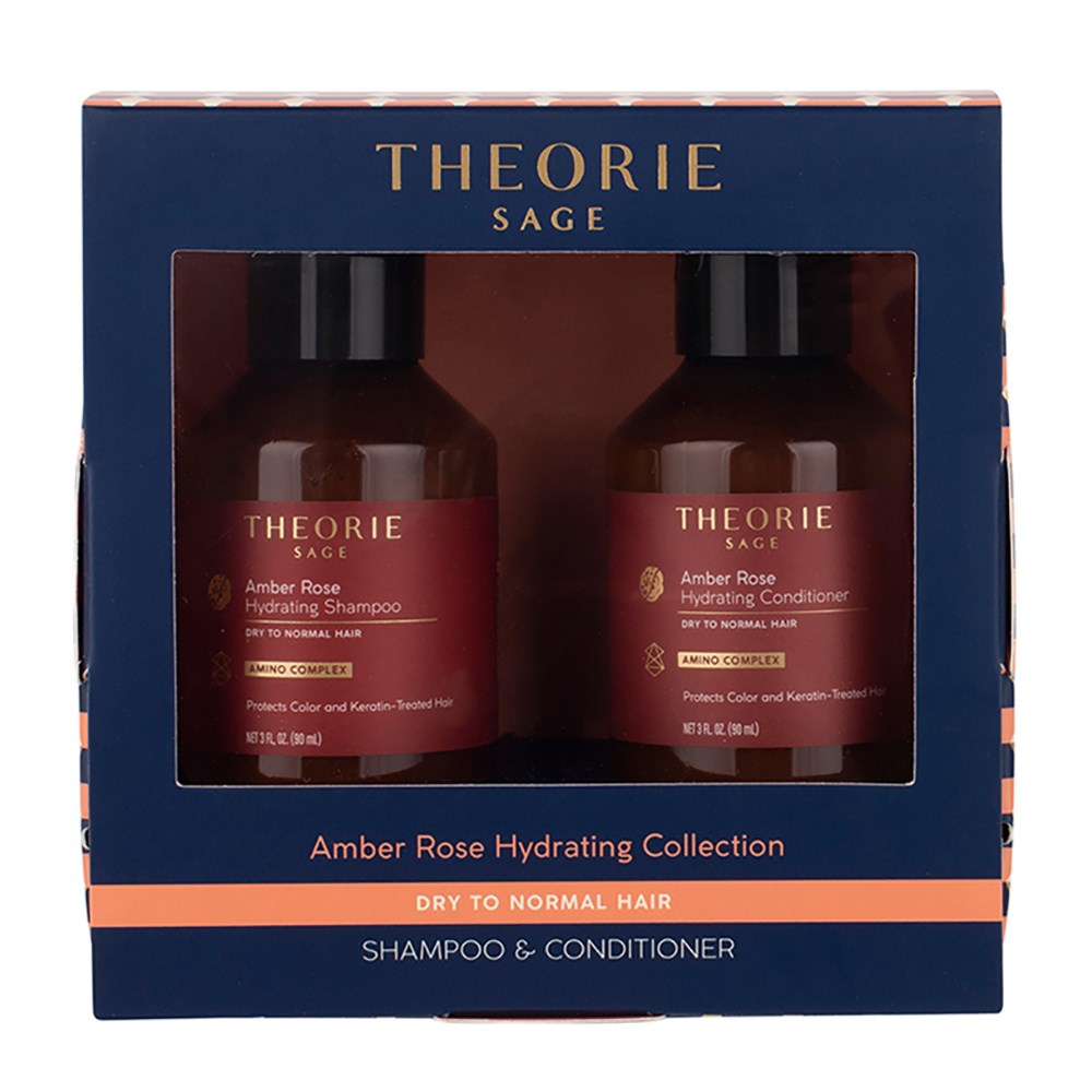 Hydrate and refresh strands with irresistibly scented Theorie Amber Rose Hydrating Travel Pack. Naturally antiseptic rose flower extract effortlessly blends with vitamin-rich sage essential oil, strengthening keratin protein and moisturising hyaluronic acid. Proprietary amino complex replenishes essential proteins and nutrients to strengthen and protect hair. This bloom-forward shampoo and conditioner are perfect for refreshing normal to dry hair, especially over-processed hair.