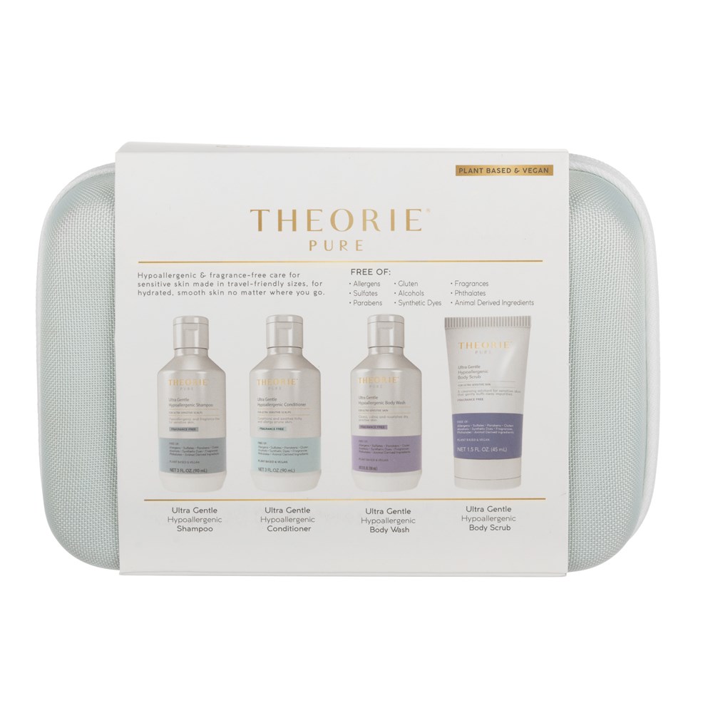 Elevating the beauty of travel. Theorie Ultra-Gentle Hypoallergenic Travel Kit is formulated to affirm the thesis that self-care can be free from compromise. Luxurious lathers which transcend the ordinary. Botanical formulations which confer benefits you can see and feel. This fragrance-free collection includes Ultra-Gentle Hypoallergenic Shampoo, Conditioner, Body Wash and Body Scrub. Ideal for sensitive types, skin and hair are gently cleansed and left radiantly glowing. Free from sulphates, parabens, gluten, alcohol, synthetic dyes, phthalates and animal-derived ingredients. Includes protective, zippered hard case.