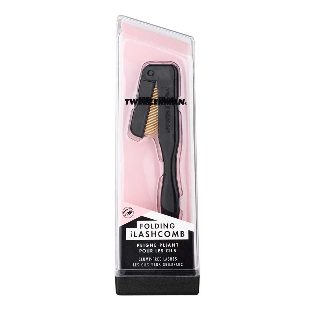 The Tweezerman Folding iLashcomb features perfectly spaced, gold-plated teeth which effortlessly glide through wet mascara for defined, evenly separated, and natural looking lashes. The teeth of the Tweezerman eyelash comb fold compactly into the handle for protection.