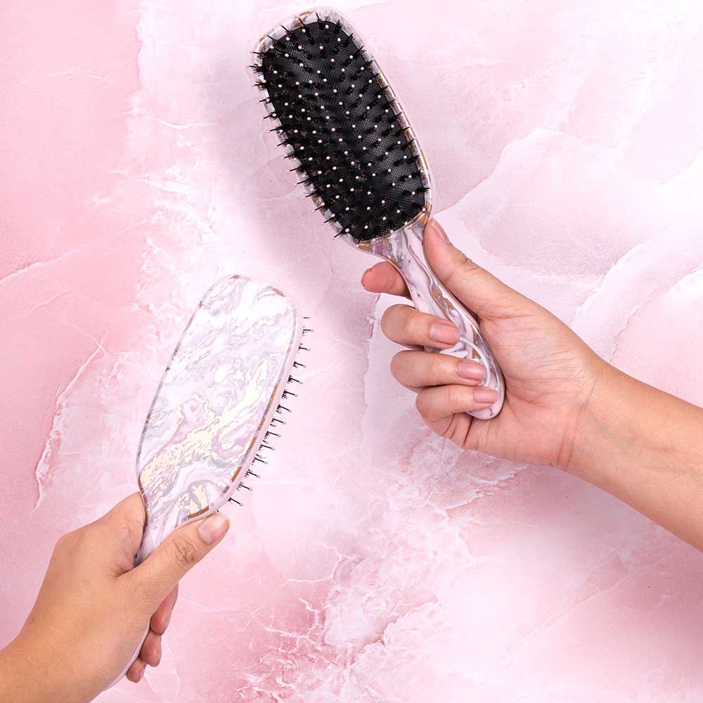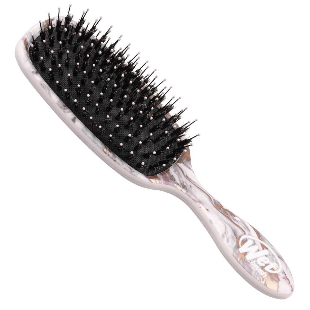 The WetBrush Metallic Marble Shine Enhancer Hair Brush in Bronze offers the best of both worlds. Boar bristles distribute the scalp’s natural oils leaving hair shiny and smooth. Exclusive, ultra-soft IntelliFlex bristles glide through tangles with ease. Effortlessly brushing out knots and detangling wet or dry hair. The Wet Brush Shine Enhancer works well with dry shampoo to evenly distribute.