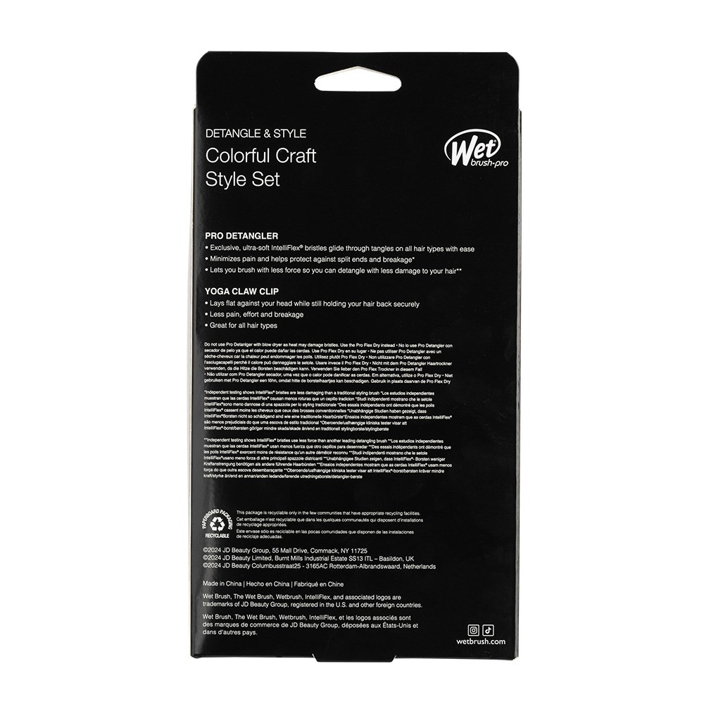 Detangle and style in colour! This limited edition WetBrush Pro Colourful Craft Style Kit includes the world famous Pro Detangler with a colourfully whimsical print, as well as a Yoga Claw Clip. Wet Brush Pro Detangler’s exclusive, ultra-soft IntelliFlex bristles glide through tangles on all hair types. Yoga Claw Clip lays flat against your head and holds hair securely with less pain. This kit is designed to prevent damage while keeping your hair in place. Painless styling comes alive in colour.
