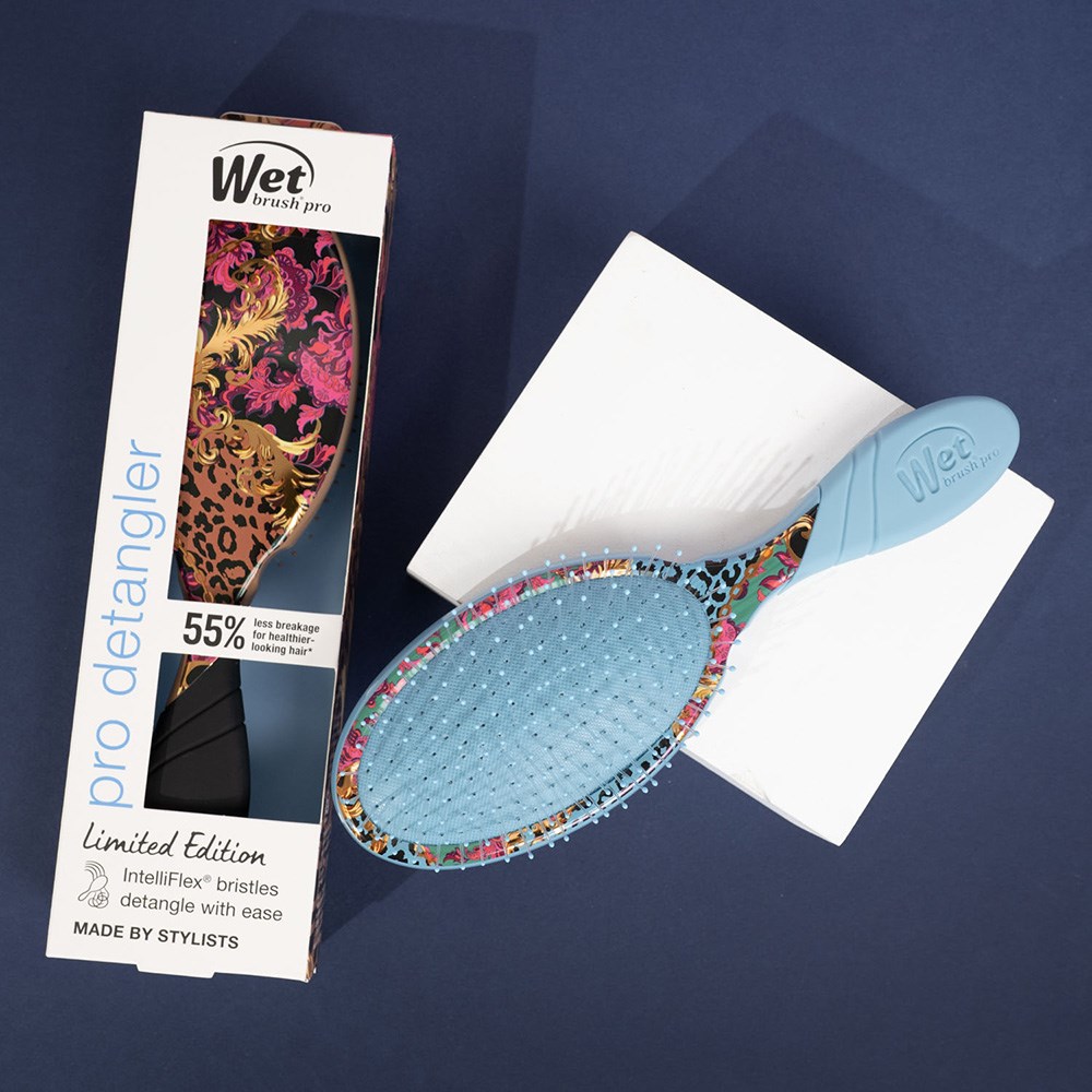 Adventure in full bloom! WetBrush Pro Floral Safari Detangler Blue features a limited edition floral animal print. This is the world famous, award-winning Wet Brush Original Detangler redesigned by stylists for stylists. Revolutionary IntelliFlex bristles diffuse knots on all hair types, wet or dry, gliding through tangles with less effort, less pain and over 55%* less breakage. Ergonomically advanced with finger rests and rubberised EasyGrip handle for more comfort and control.
