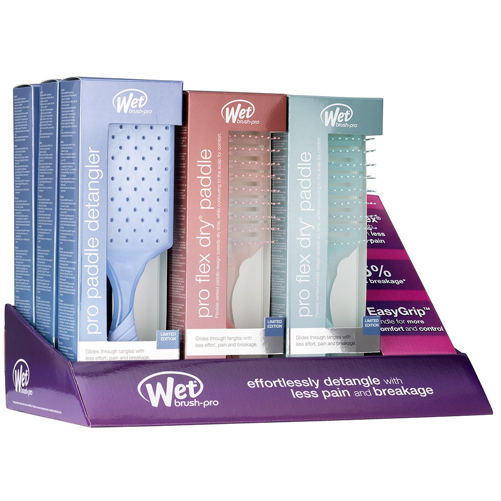 Bring a splash of colour and serious detangling power with WetBrush Pro Hydro Tie Dye Display 9pc. With a mix of Wetbrush’s iconic paddle detanglers and Flex Dry hair brushes, you are sure to cover all bases for faster detangling and blow-drying. The secret? Exclusive, ultra-soft IntelliFlex bristles that minimise breakage, effort, and pain with every stroke and HeatFlex bristles that are blow-dryer safe and glide through tangles like a breeze.