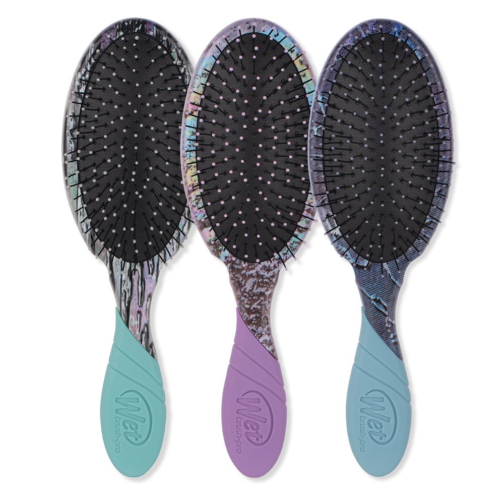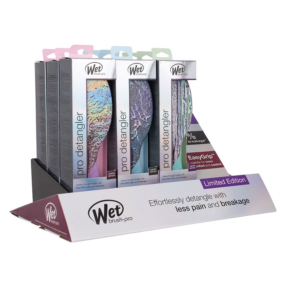 A truly enlightening detangler. This limited edition WetBrush Pro Super Slick Detangler Hair Brush Display 9pc contains three of each WetBrush Pro Super Detangler Brush in gleaming iridescent patterns. Featuring IntelliFlex bristles to remove knots with extraordinary ease and rubberised EasyGrip handle for more comfort and control.