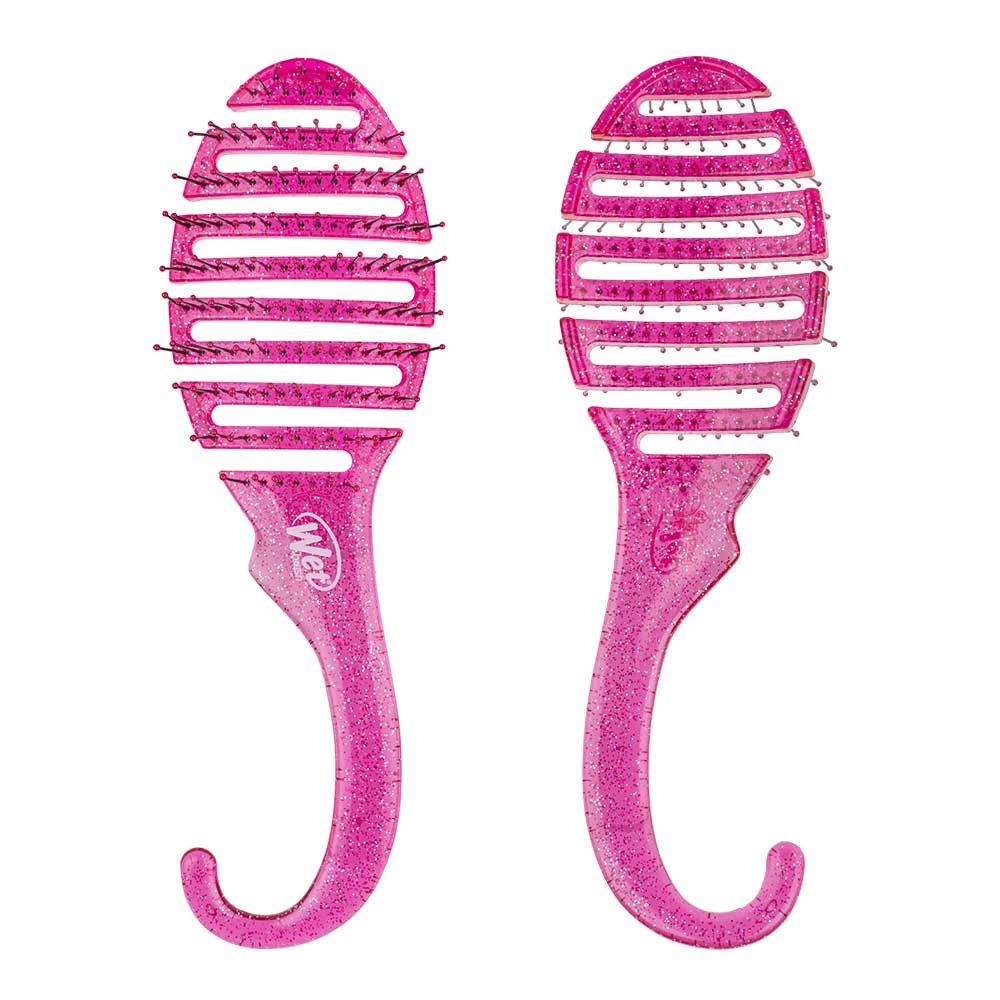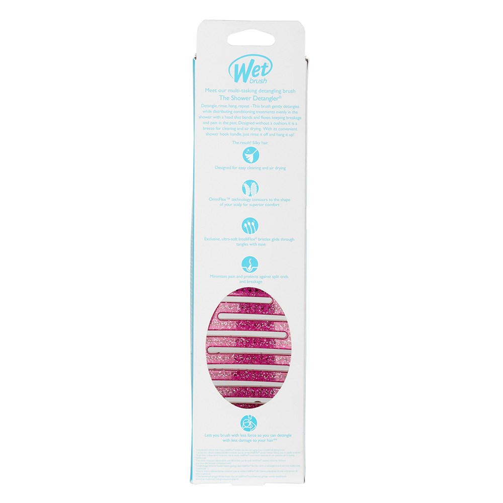 This sparkling brush knows how to multitask. WetBrush Shower Detangler Hair Brush Pink Glitter gently detangles while distributing conditioning treatments evenly in the shower. Designed without a cushion for easy cleaning and air drying – not to mention the convenient shower hook handle! Exclusive Wet Brush IntelliFlex bristles glide through tangles with ease.