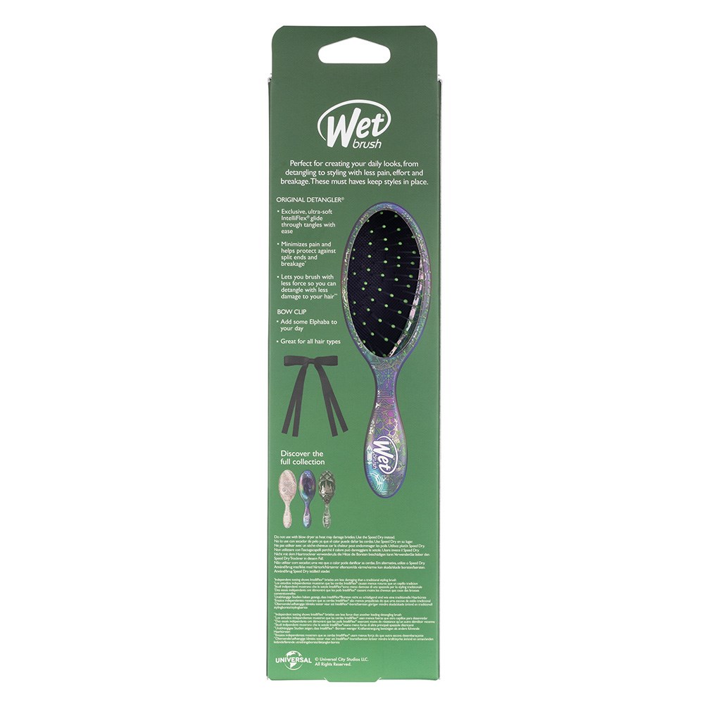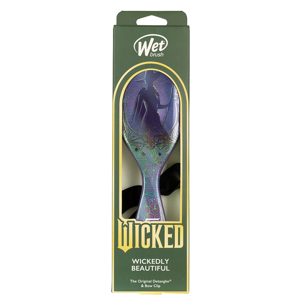 Dance through your detangling routine with the limited edition WetBrush Wicked Elphaba Detangling Kit. Perfect for creating your daily looks, including detangling and styling, with less pain, effort and breakage. This Wet Brush kit includes the world famous Original Detangler with an Elphaba inspired print, as well as a Bow Clip. 100% happier hair with the Original Detangler featuring exclusive IntelliFlex bristles, while the Bow Clip adds some Elphaba to your day.